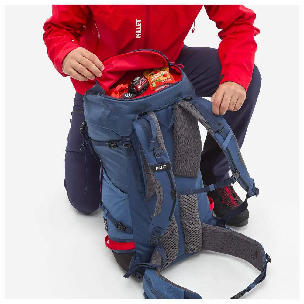 With a generous capacity of 45 litres + 10 additional litres made possible thanks to the adjustable lid closure, the Millet Peutery Integrale 45+10 is a mountain backpack that will follow you year-round, in summer and winter alike, with its numerous features for all your multi-day adventures. It allows to attach skis on the sides, has a direct access compartment for crampons, while the adjustable hip belt and ergonomically shaped shoulder straps ensure good load distribution for more comfort. Reasonably waterproof and breathable, it protects your gear from short rain falls.