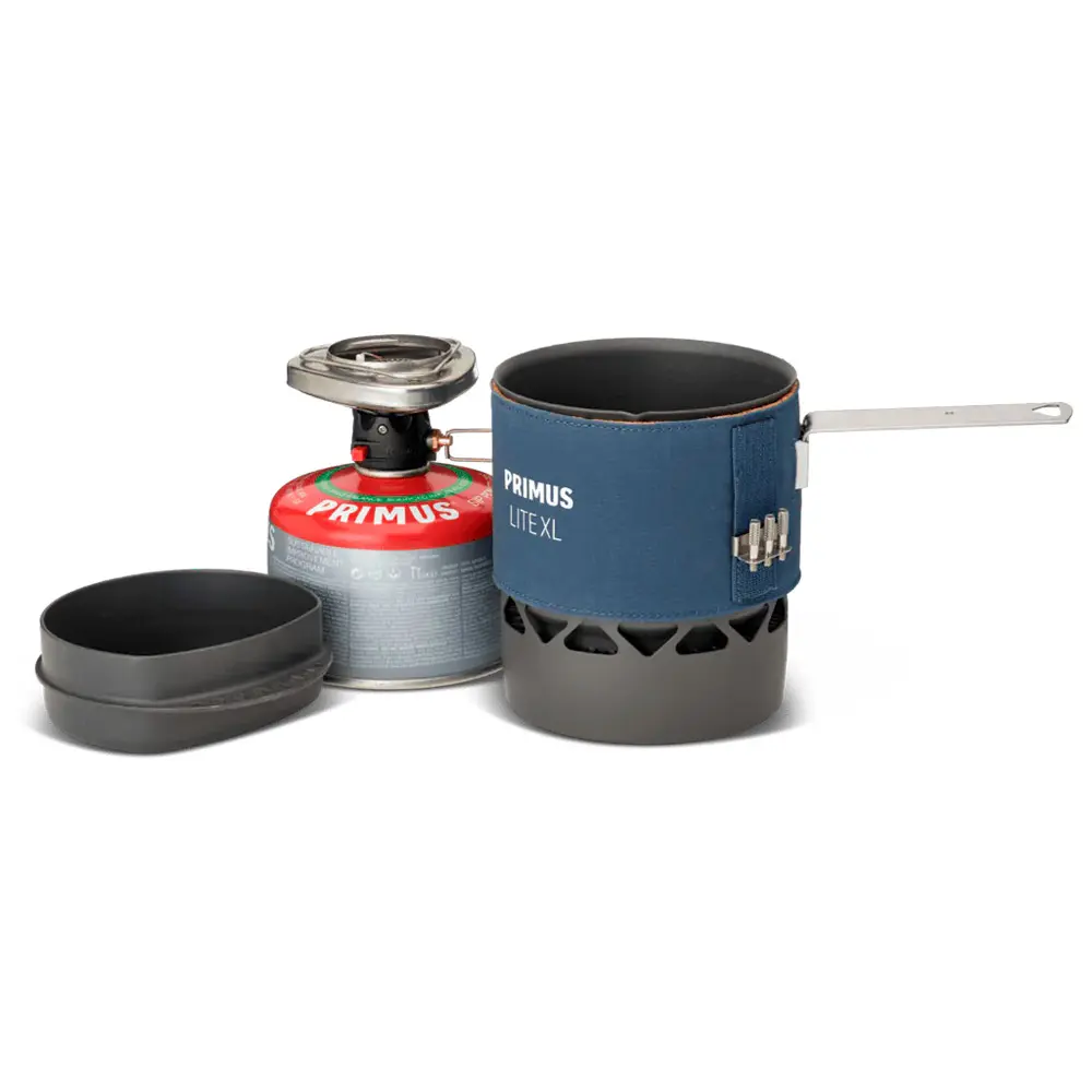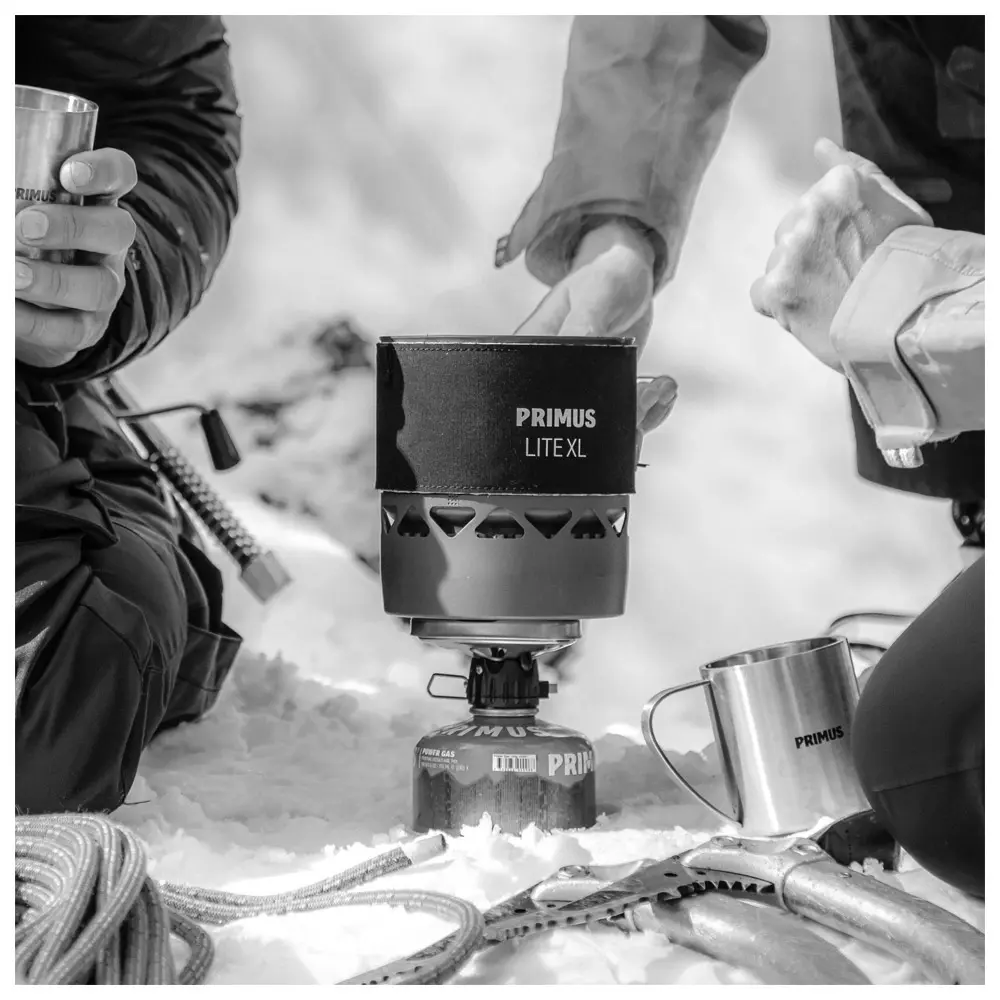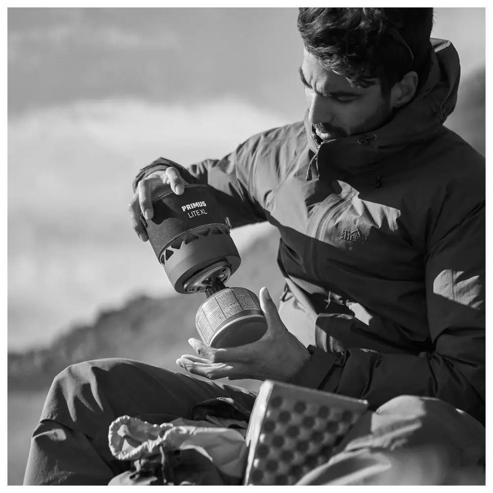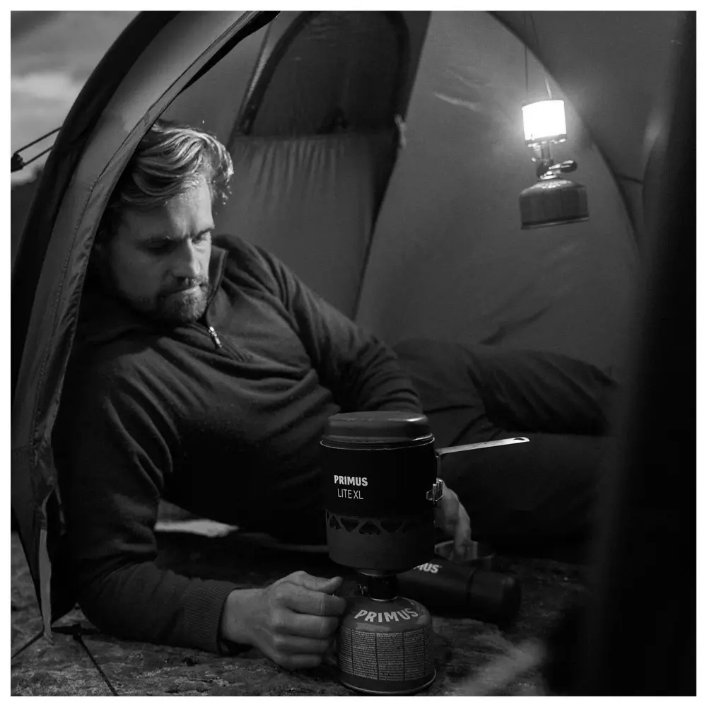 The Lite XL Stove System from Primus is a bigger version of the Lite Stove System. This gas camping stove is both versatile and easy to carry. The 1L volume pot features a pour spout, a removable handle and a cover that can be used as a mug. The Laminar Flow Burner technology lowers the centre of gravity of the camping stove, making it lighter, more compact and stable. The igniter and a 230g gas canister (not included) can be stored in the pot to limit the room the system takes in a backpack. The stove lights easily thanks to an electric piezo system, no need to bring a lighter. You can then precisely adjust the power of the flame thanks to the control valve. This stove comes with an additional stand that attaches to your gas canister, for more stability. If you cannot find a flat surface to cook you can suspend the stove thanks to the suspension kit. Finally, it is possible to use an alternative pot or pan thanks to the included support pegs.