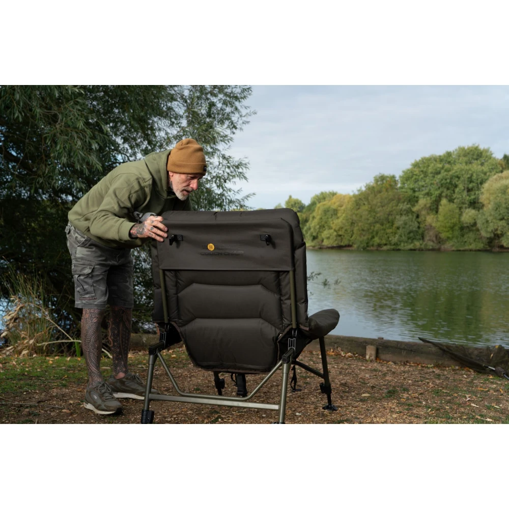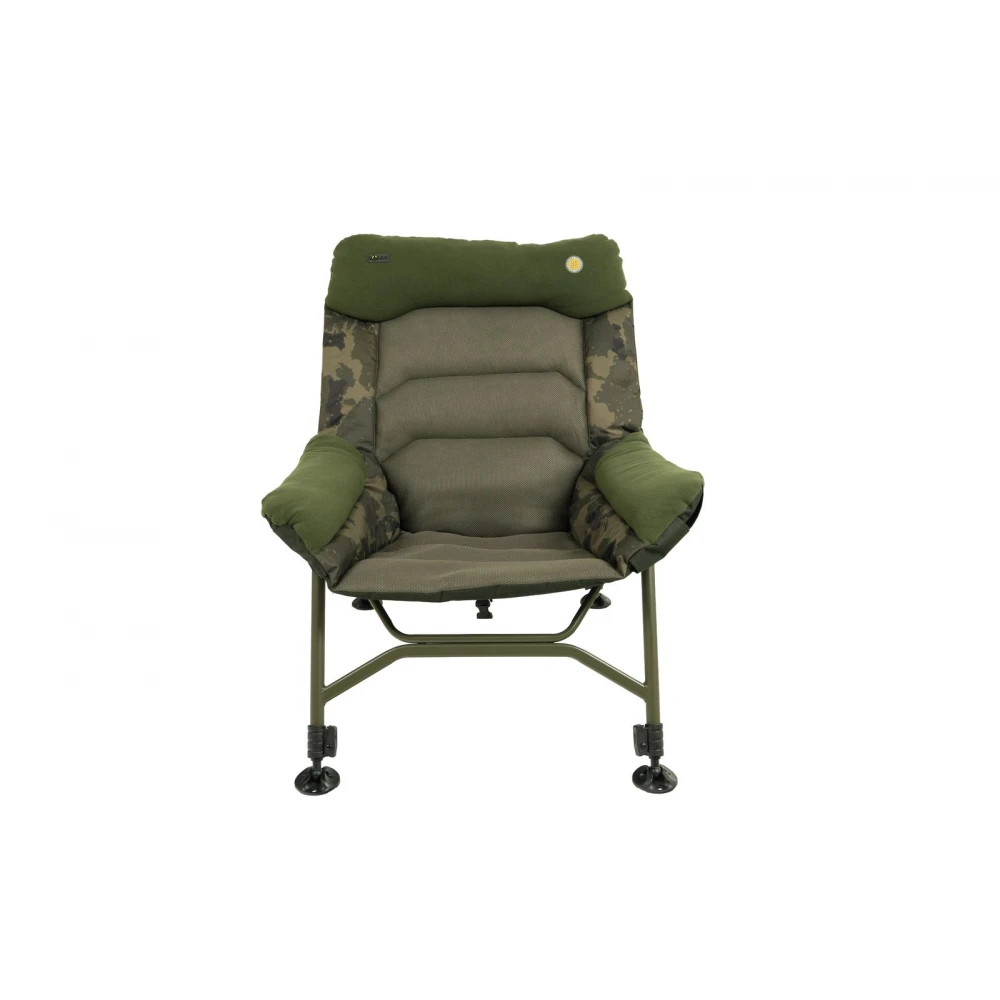 Inspired by Solar’s popular Sofa™ Recliner, this streamlined version offers the same ergonomic comfort in a more compact, accessible design. The oversized, deeply padded seat ensures long-lasting relaxation, while the combination of high-density foam and breathable 2D mesh provides excellent air circulation and durable comfort. The 600D water-repellent WorldWide™ Camo fabric makes the chair strong and weather-resistant, and the sturdy powder-coated steel frame guarantees reliable support. The Solar Ratchet Recliner system offers five locking positions from fully flat to upright, while the four spring-loaded, adjustable legs ensure stable positioning on any terrain. For added comfort, the head and arm sections feature soft fleece zones, and the compact folding system makes transport and storage easy.