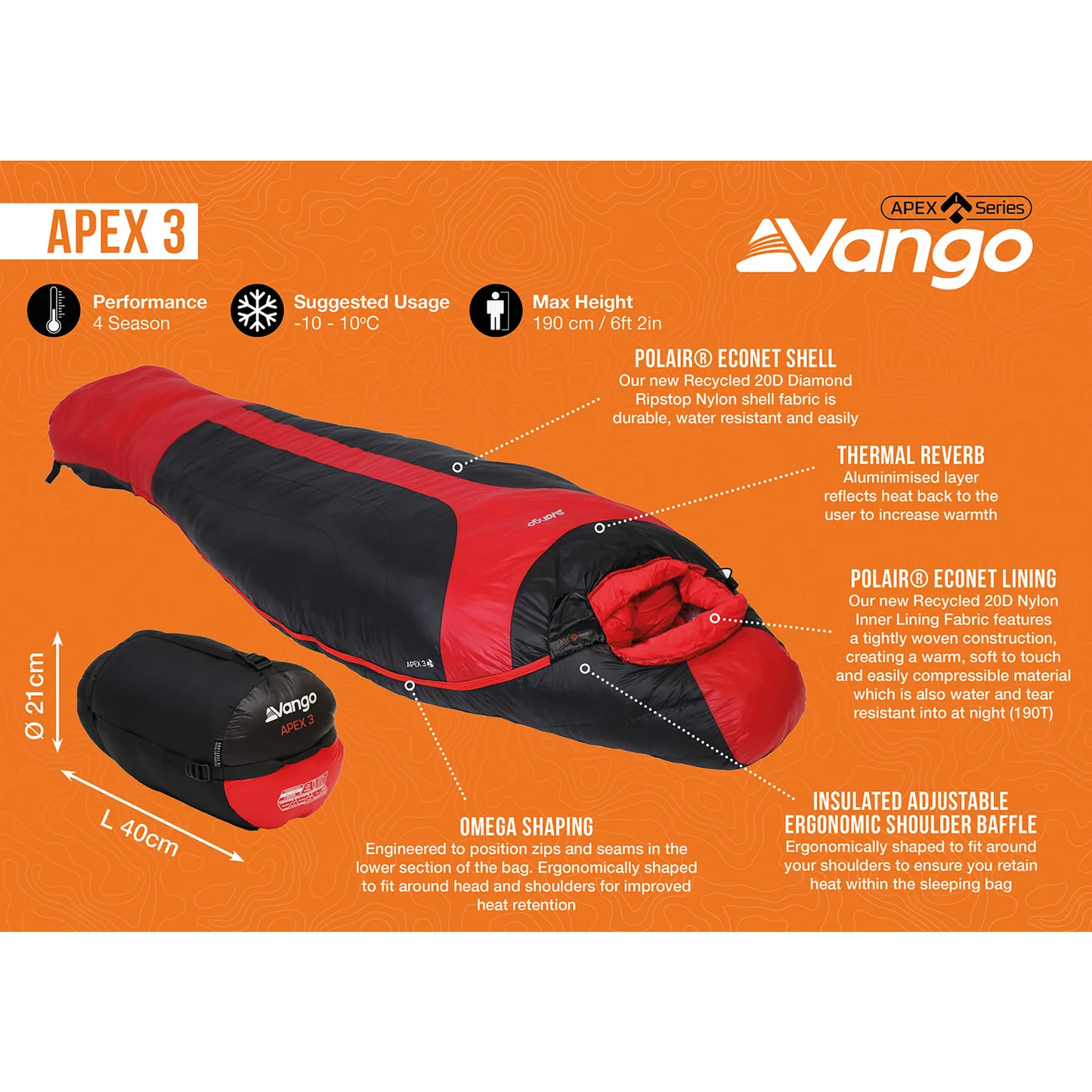 The Vango Apex 3 Sleeping Bag has been designed for 4-Season use and is made with Vango’s most innovative, environmentally friendly fabrics to date. It features Polair® EcoNet Lining made from recycled fishing nets and EcoLoft® insulation, a recycled synthetic, engineered to imitate the characteristics of real down filling. This Omega shaped bag has been ergonomically tailored around the head and shoulders to retain heat and its unique Thermal Reverb causes heat to reflect back onto the body making this bag the very pinnacle of thermal efficiency.