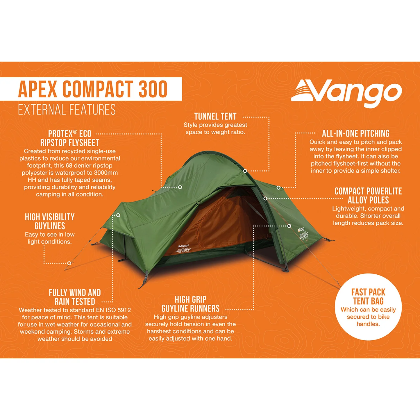 Introducing the exciting, lightweight and innovative new Apex Series from Vango, designed for adventurers who need a compact, high quality, lightweight tent. As part of the Earth Collection, the Apex is made using 70D Protex® Eco fabric, created from recycled single-use plastics. Unique to Apex is the 30cm pole sections which make it ideal for packing light on any adventure, from mountaineering, hiking and Duke of Edinburgh’s Award activities to bike packing, as its unique pack design can attach to bike handlebars. The Apex makes excellent use of your available space and has a number of other features from strong PowerLite Alloy Poles, part mesh doors for ventilation in summer or use abroad and O-Shaped Doors that make it easy to open with one hand and also frames those views.
