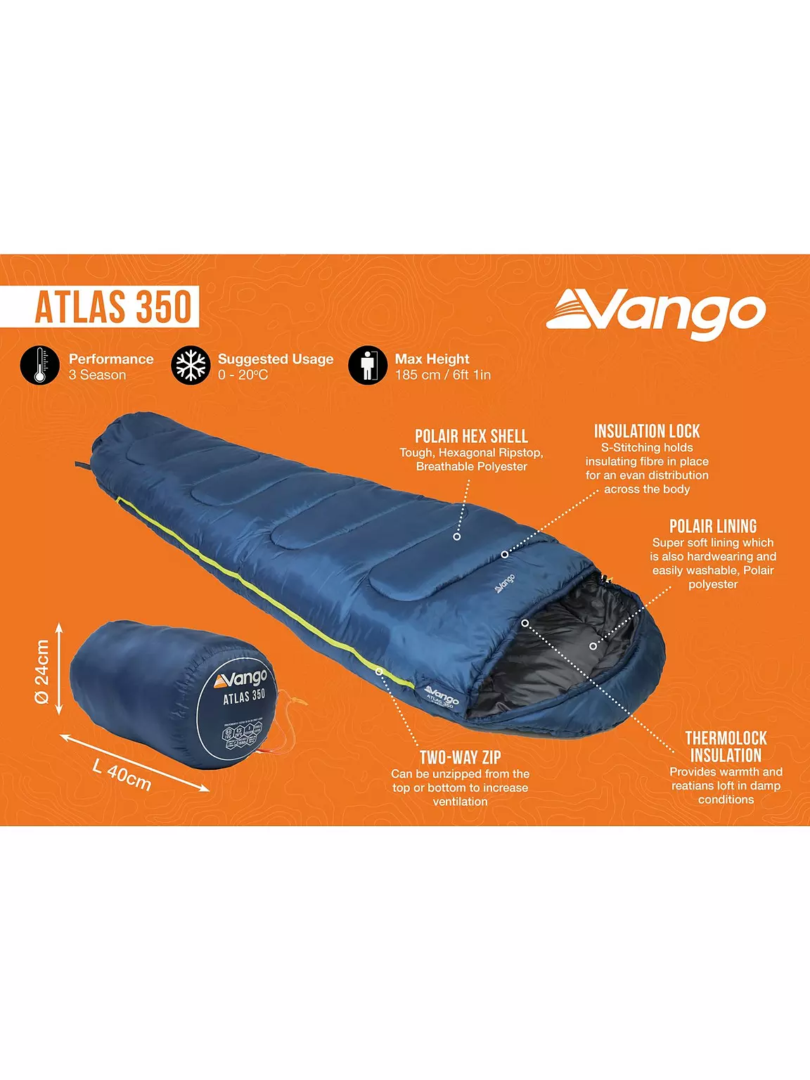 The Atlas 350 is a great sleeping bag for a first-time adventurer, wherever you go. This tri-season mummy-shaped bag, with its TOG rating of 9.5 and great quality fabric and fills, make it incredible value for money.