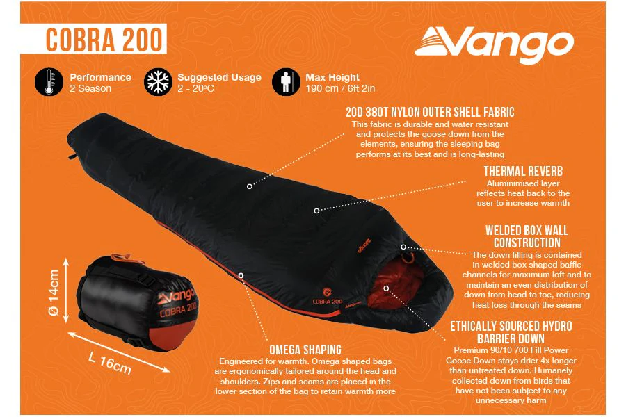 The Vango Cobra 200 sleeping bag is a great choice for outdoor enthusiasts who prioritize warmth and comfort. Its welded box wall construction, Hydro Barrier Down insulation, and soft inner lining provide excellent insulation and a comfortable fit. Additionally, its durable and water-resistant outer shell and ethical sourcing of materials make it a responsible choice for those concerned with sustainability.
