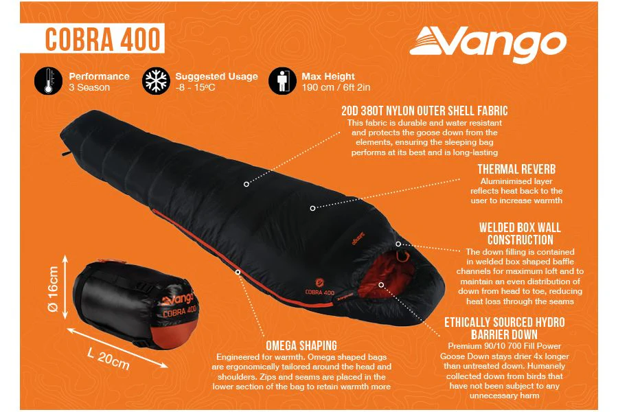 The Vango Cobra 400 sleeping bag is a great choice for outdoor enthusiasts who prioritize warmth and comfort. Its welded box wall construction, Hydro Barrier Down insulation, and soft inner lining provide excellent insulation and a comfortable fit. Additionally, its durable and water-resistant outer shell and ethical sourcing of materials make it a responsible choice for those concerned with sustainability.