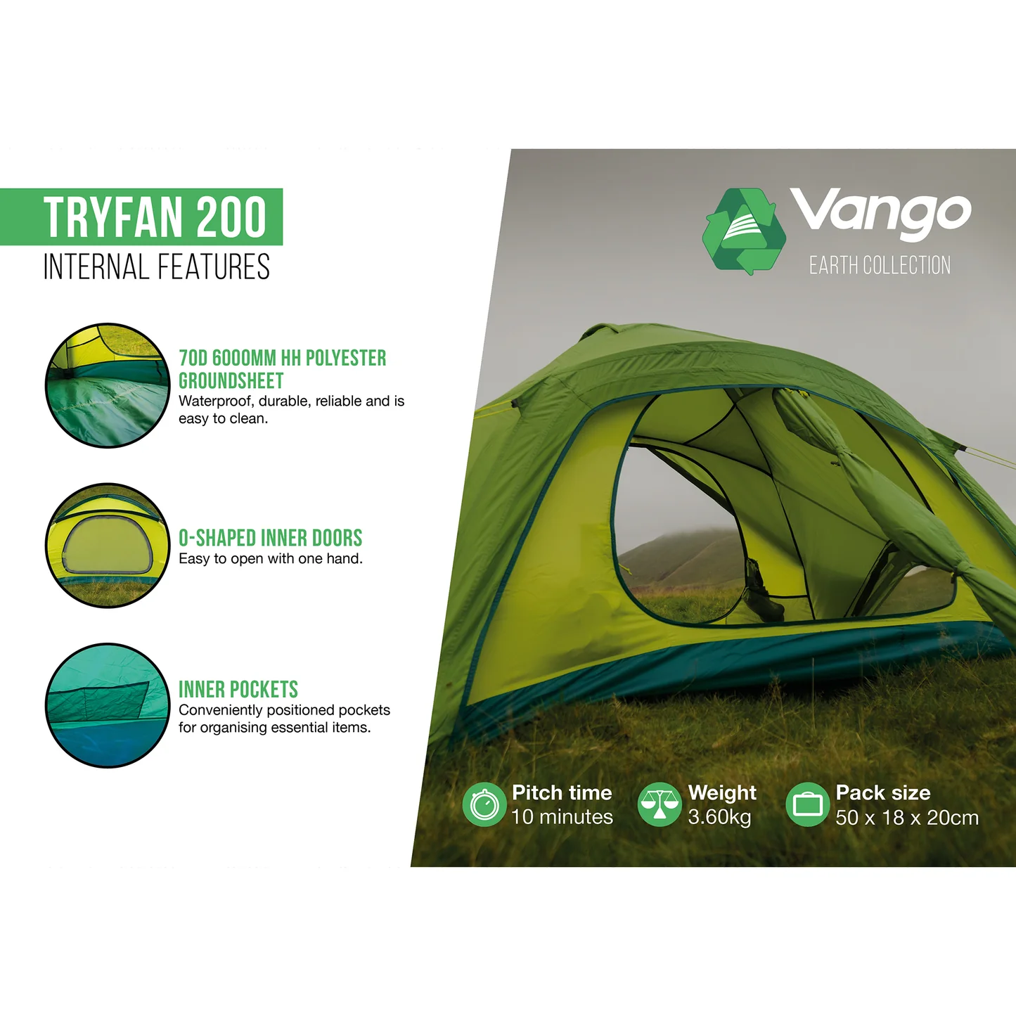 The Vango Tryfan 200 features a Protex 70D polyester flysheet, which is both waterproof and breathable, ensuring that you stay dry and comfortable inside the tent, even in wet weather. The bathtub-style groundsheet is made from durable polyethylene, which helps to keep water and dirt out of the tent.