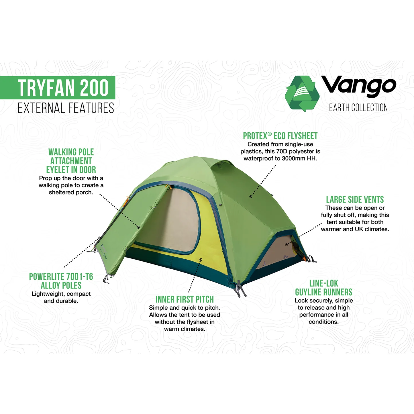 The Vango Tryfan 200 2-man tent is designed to cope well with a wide range of weather conditions, making it suitable for trekkers and backpackers across the globe. It benefits from generous inner space and the combination of two extra-large side vents and mesh doors delivers excellent ventilation. When they are not required, all vents can be securely closed using the zip panels. The 70D flysheet is made from single-use plastics with a 3000mm HH. It pitches inner first, and can be pitched inner only when required in very hot climates. The twin entrance vestibules provide additional storage space and shelter.