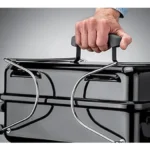 - Plated steel legs pivot to lock lid in place for carrying
